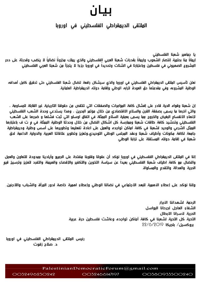 وقام الملتقى باصدار بيانه الاول بيان الاعلان عن انفسهم بعد اجتماعهم في بروكسيل يوم السبت الماضي الذي شهد انتخاب المجلس الاداري وانتخاب المناضل الدكتور صلاح زقوت رئيساً للملتقى كما جرى انتخاب رؤساء للجان التي تم الاتفاق عليها وكذلك اعضائها من الهيئه الادارية.